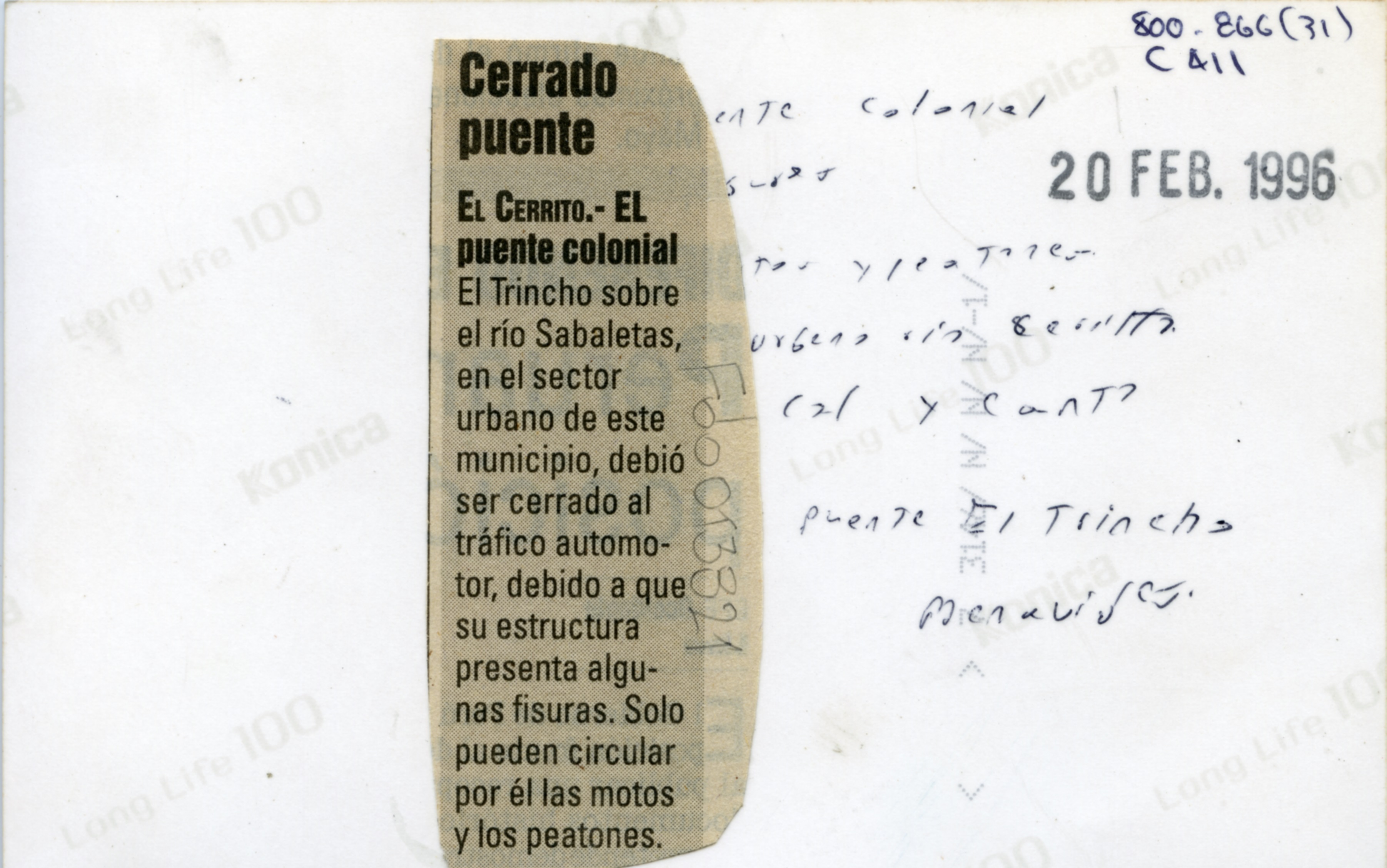 Puente colonial El Trincho, sobre el río Sabaletas. Durante el momento del reportaje el puente tuvo que ser cerrado al tráfico automotor debido a fisuras.
