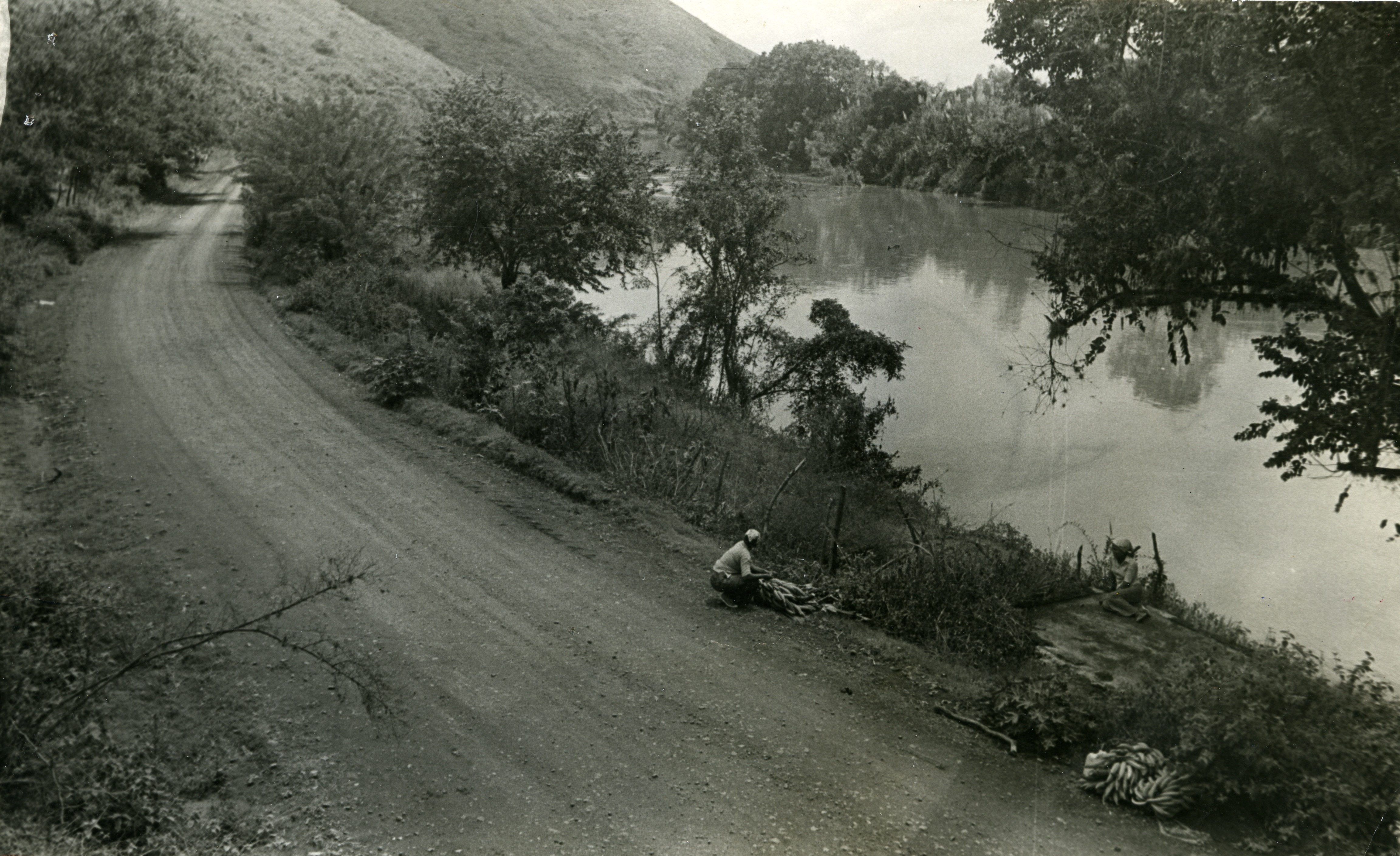 En la fotografía se observa unas campesinas con sus racimos de plátanos a un lado de la carretera, al otro lado se encuentra el río Cauca. Al reverso dice: ¨Vijes. Los primeros estudios para contratar la ampliación, rectificación y pavimentación de la carretera de la margen izquierda del río Cauca-la Autopista Panorama del Valle-, fueron contratados ya por la administración Arizabaleta Calderón. La foto muestra un un tramo de la vía, entre Vijes y Mediacanoa, con el río Cauca a su lado.¨