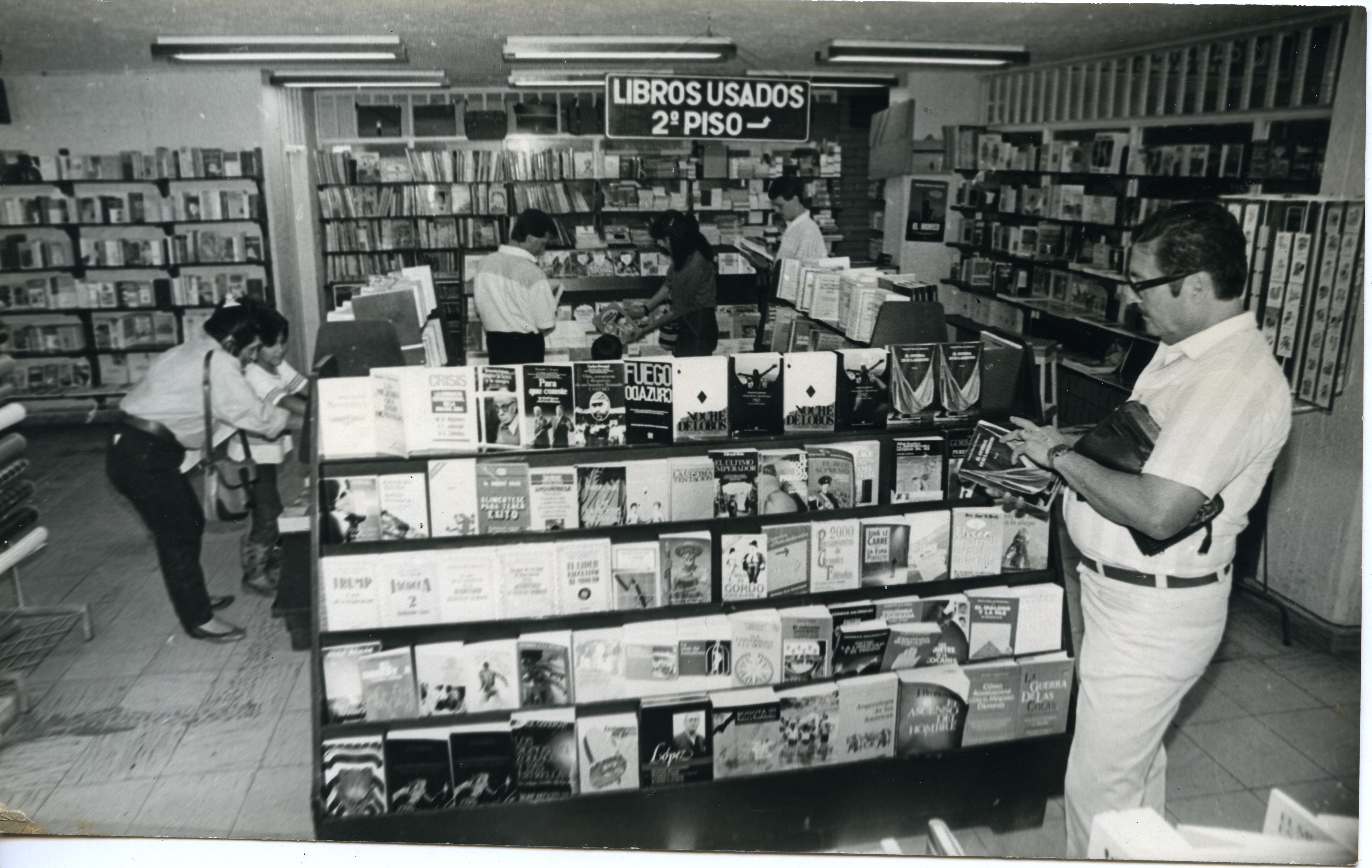 En la gráfica se aprecia personas en el interior de la librería. situada en el centro de Cali, su actividad se centra revistas, papelería, libros y discos nuevos usados y viejos, tertuliadero