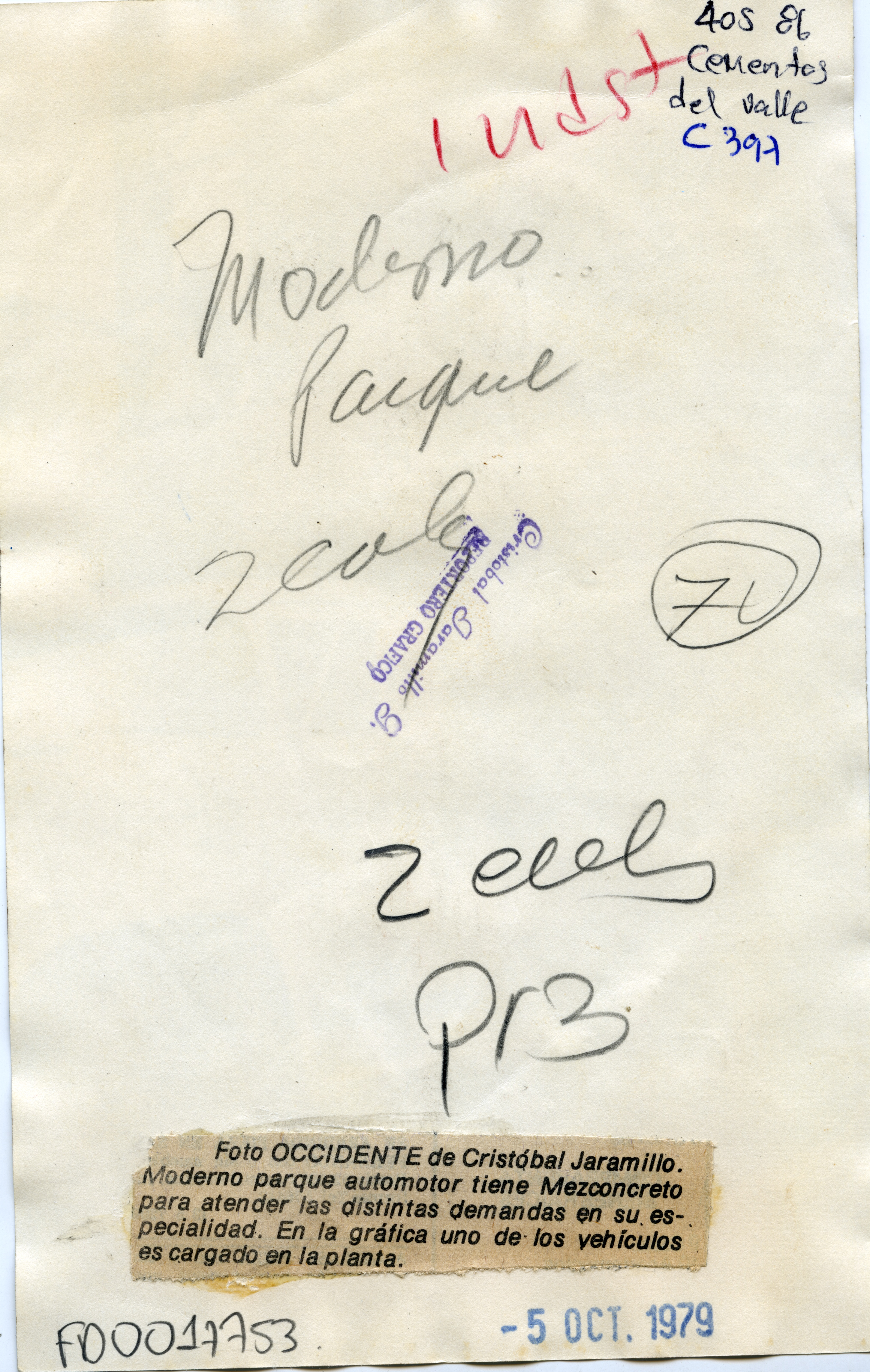 Yumbo, Puerto Isaacs, Cementos del Valle. Moderno parque automotor tiene Mezconcreto. Observamos tanques de mezcla de concreto con cargador. Se aprecia camión transporte de Mezclas de Concreto LTDA. Al reverso de la fotografía se anexa recorte: Moderno parque automotor tiene Mezconcreto para atender las distintas demandas en su especialidad. En la gráfica uno de los vehículos es cargado en la planta