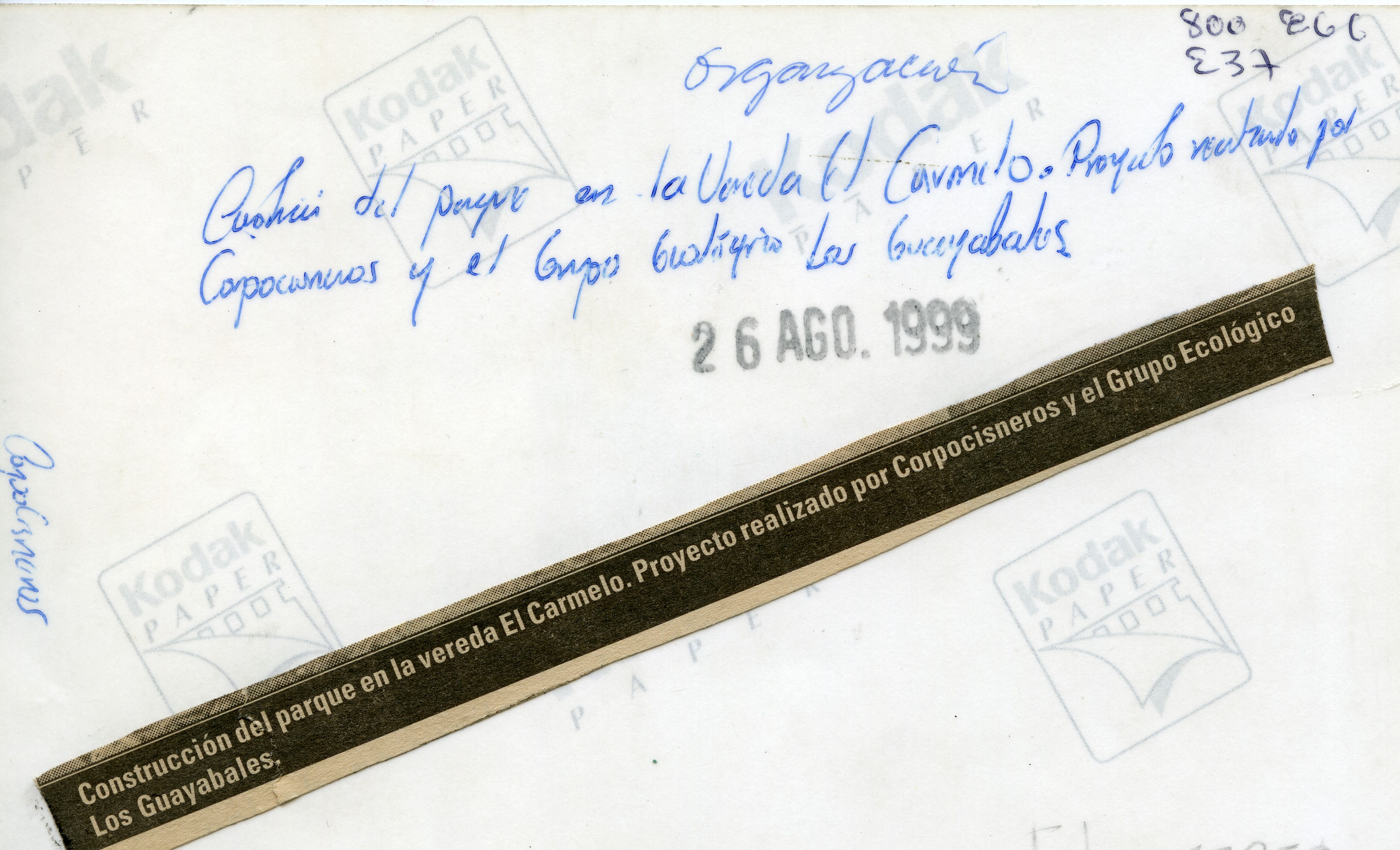 Al reverso de la fotografía se anexa el pie de foto del periódico: "Construcción del parque e la vereda El Carmelo. Proyecto realizado por Corpocisneros y el Grupo Ecológico Los Guayabales".