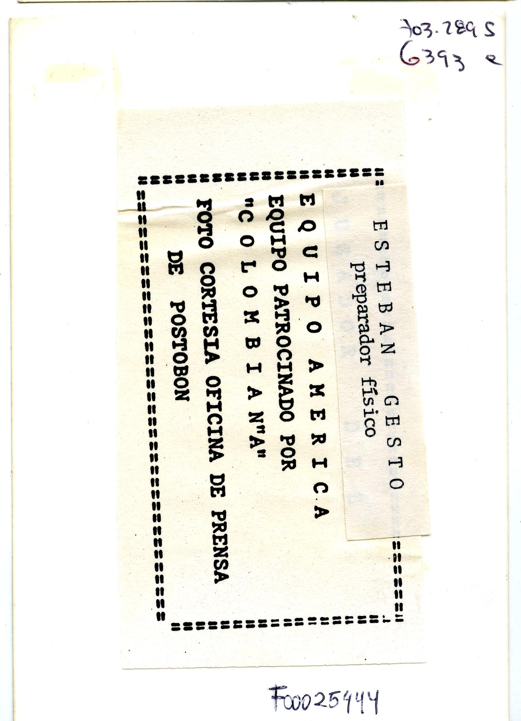 dc.description.abstract | Reverso:Esteban Gesto preparador físico. Equipo América. Equipo patrocinado por Colombiana" Foto cortesia oficina de prensa de Postobón | spa |
