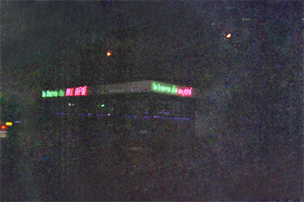 Se observan luces de neón de negocio La Barra de mi Apá en el barrio Las Granjas. Exterior noche. Plano general.