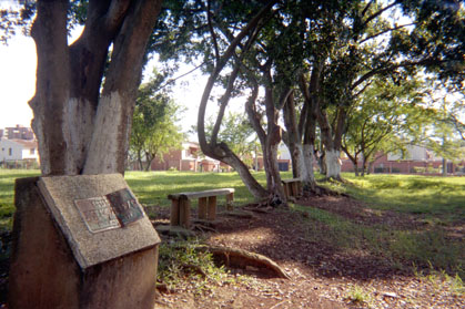 Plano medio. Exterior día. Arboles en sentido continuo. Casas de fondo. Realce de placa conmemorativa en inferior izquierdo.