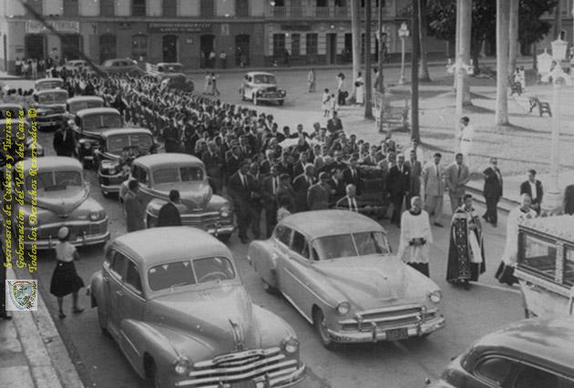 Se observan las características de los vehículos de la época y la forma como avanza el cortejo a un lado la gente y al otro los carros.