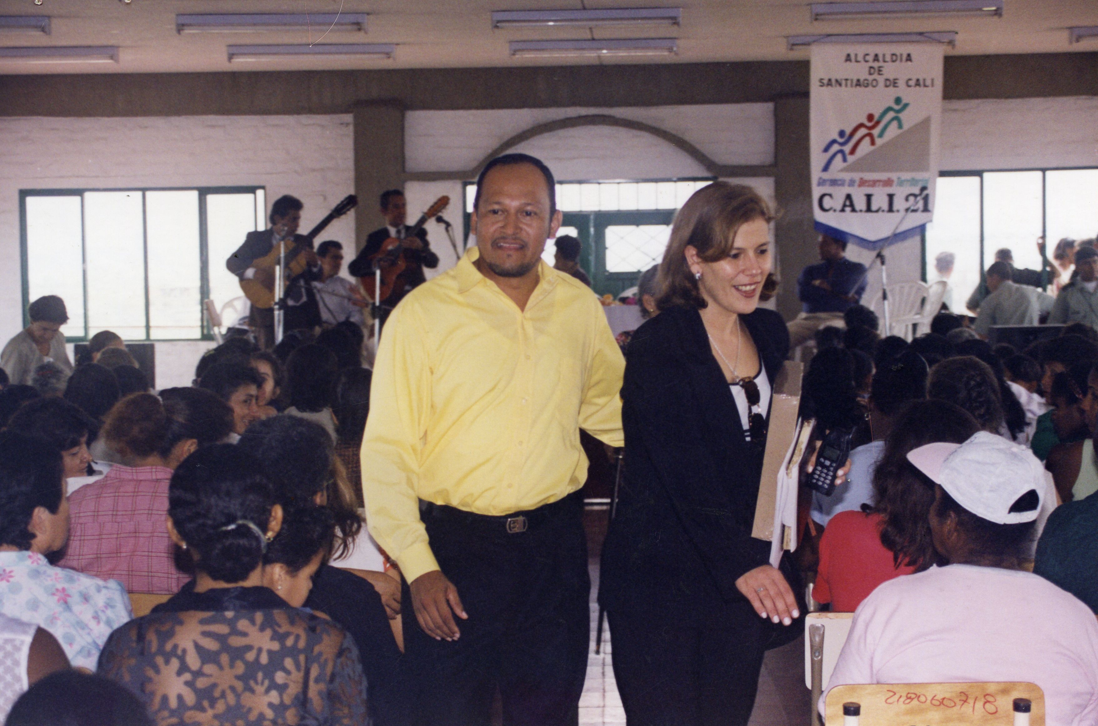 Olga María Betancur, gerente de desarrollo territorial, sosteniendo unos documentos y un celular de la época y al lado derecho Juán Antonio soto director del Cali 21, al fondo unos músicos y rededor personas sentadas.
