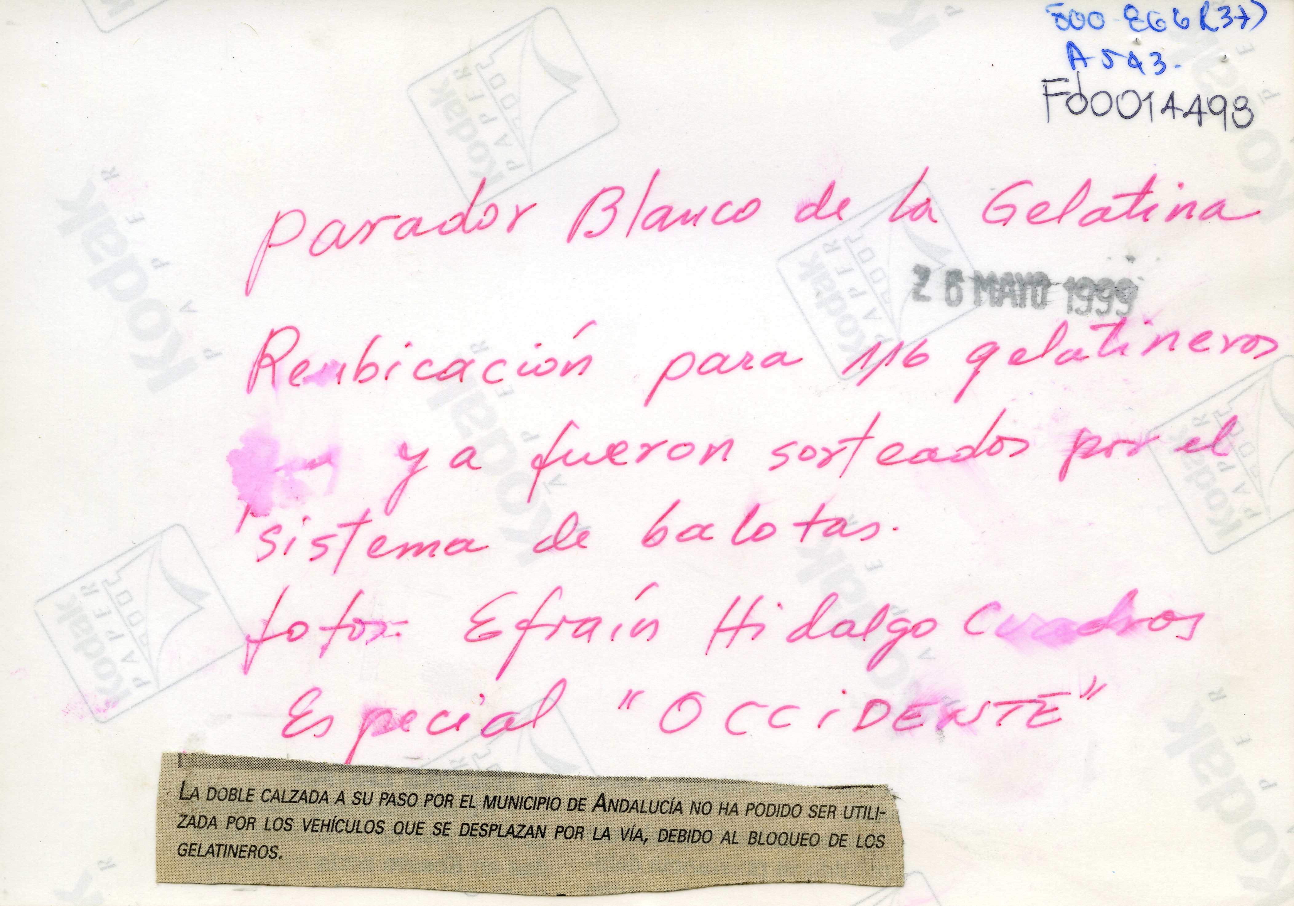 Vista de la doble calzada en construcción y además del Parador Blanco. Al reverso de la fotografía se anexa nota manuscrita y recorte: "La doble calzada a su paso por el municipio de Andalucía no ha podido ser utilizada por los vehículos que se desplazan por la vía, debido al bloqueo de los gelatineros". "Parador Blanco de la gelatina. Reubicación para 116 gelatineros ya fueron sorteados por el sistema de balotas."