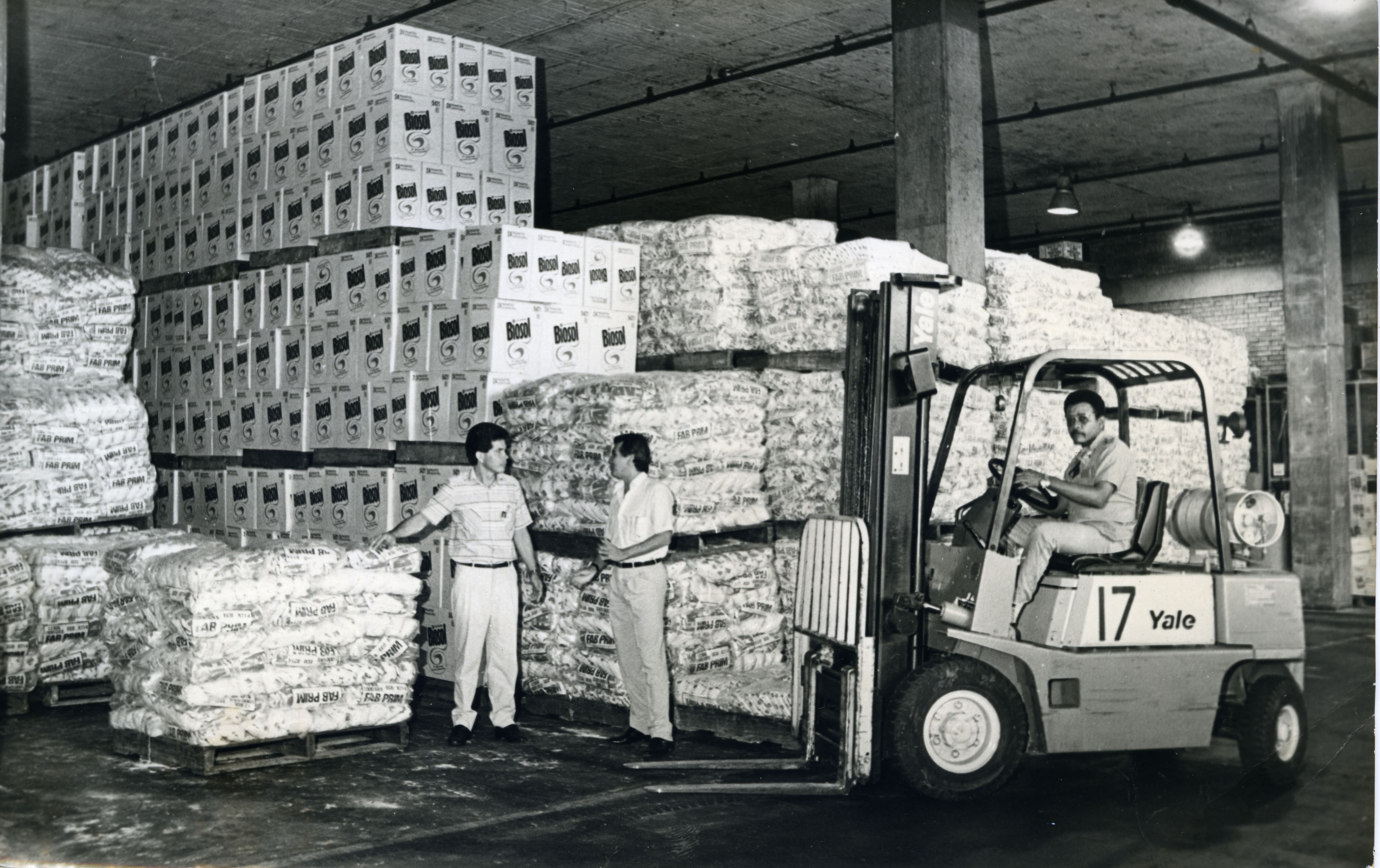 Bodega donde se almacenan productos terminados, en la imagén se ven tres operarios, uno de ellos en el montacargas.