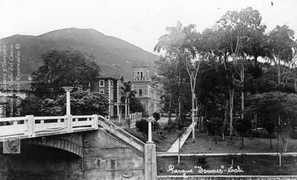 Puente España y Parque Jorge Isaacs. Santiago de Cali, fecha aproximada, 1940.