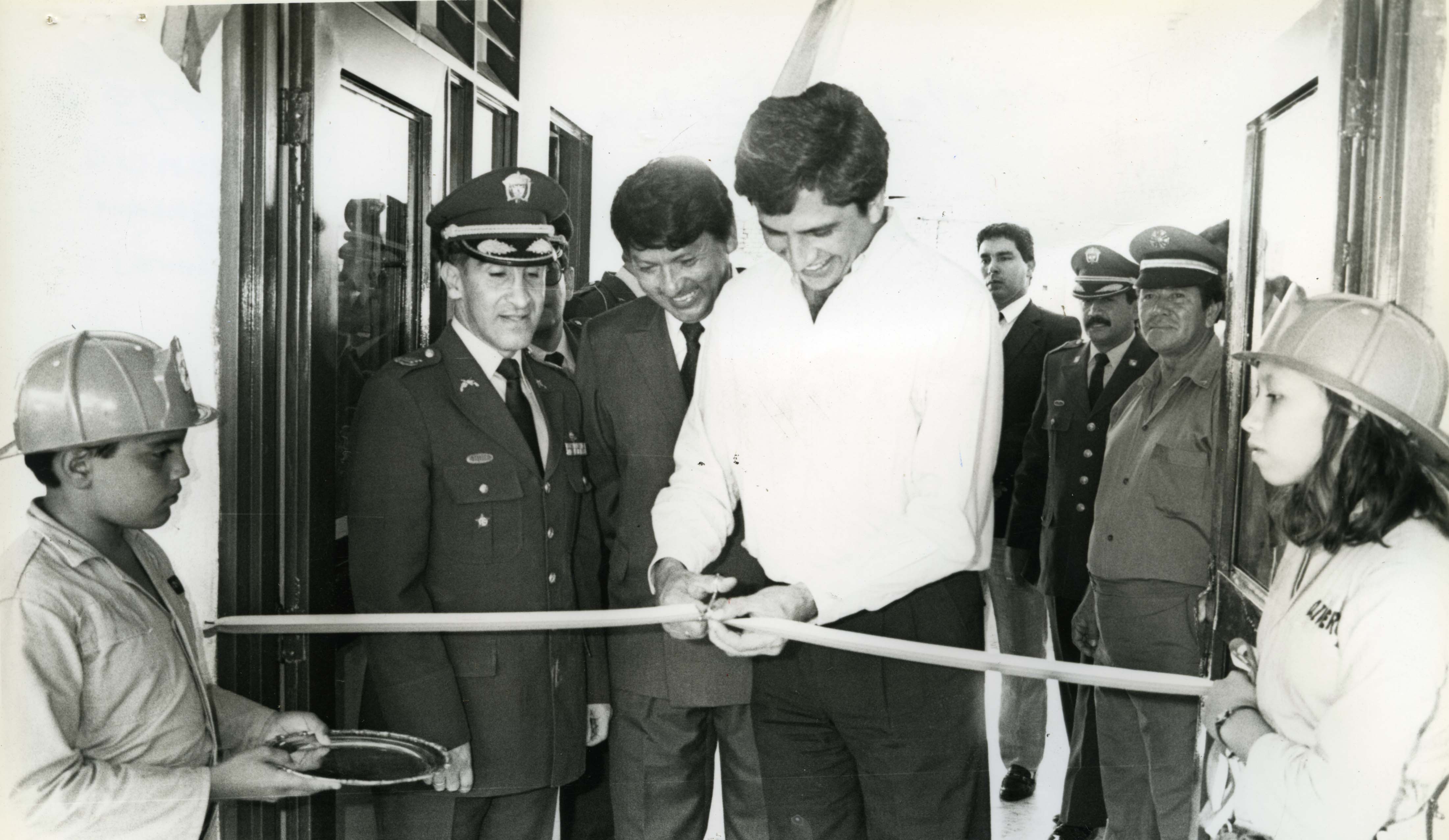 En el pie de foto dice lo siguiente: En sencillo acto cumplido en las instalaciones de la nueva inspección de Policía para Bolívar, el mandatario departamental Mauricio Guzmán Cuevas y el coronel Alberto Pulido Barrantes, cortan la cinta dando por inaugurado esta nueva sede policial. Observa el titular de gobierno Ramiro Devia Criollo. Visevalle se vinculó a la obra dotándola totalmente del mobiliario necesario. /// El Archivo del Patrimonio Fotográfico y Fílmico del Valle del Cauca es responsabilidad de la Biblioteca Departamental del Valle Jorge Garcés Borrero, por convenio de cooperación suscrito con la Secretaria del Cultura Departamental, con el fin de aunar esfuerzos para su conservación, preservación y divulgación del Archivo entre la comunidad Vallecaucana, especialmente entre los estudiantes e investigadores que visitan la Biblioteca, propiciando el su uso y consulta permanente. La universidad Icesi es un colaborador en el proceso de difusión, facilitando la tecnología que permite la consulta de las imágenes.