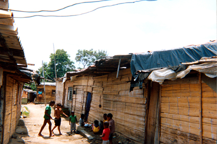 Plano general de un camino de tierra entre casas hechas en guadua. El autor nos describe que esta invasión se encuentra en el barrio Villa Blanca. Los techos, algunos de ellos son de zinc y otros tienen plásticos. Al fondo, más casas de guadua y árboles.