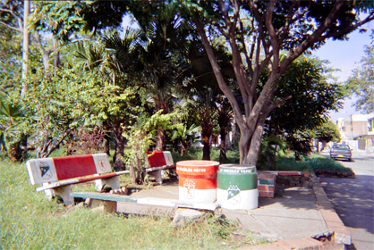 Quintana Sánchez, N. R. (2005). Parque en el cual se observan bancas y cilindros tipo mesa con los escudos de los equipos de fútbol de la ciudad. Santiago de Cali: Biblioteca Departamental Jorge Garces Borrero.