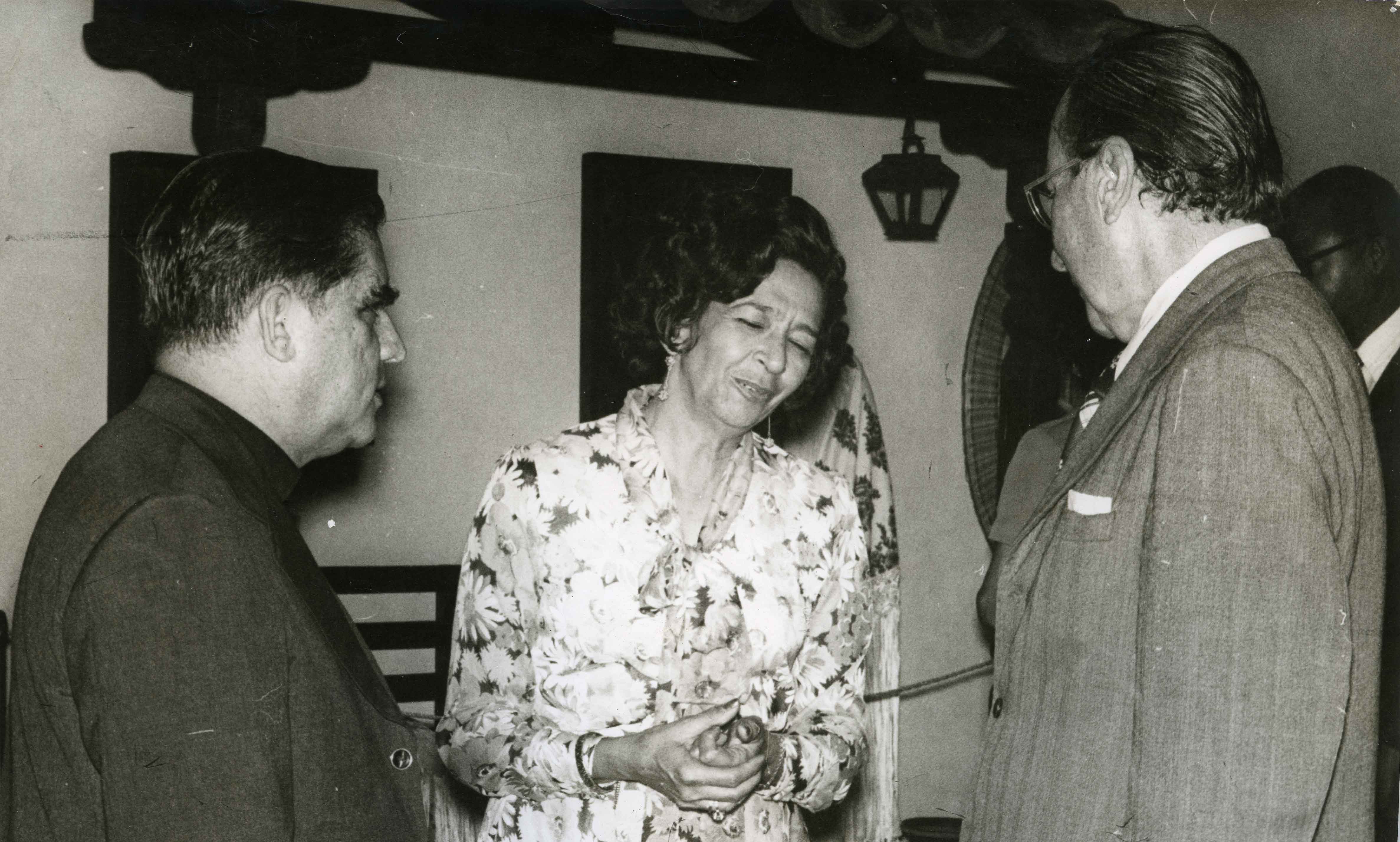 En el pie de foto dice lo siguiente: Aparecen de izquierda a derecha. José Cadena Obispo de Cartago, Señora Nelly Guzmán de Soto, directora de la casa del Virrey y el alcalde Daniel Caicedo.- El Archivo del Patrimonio Fotográfico y Fílmico del Valle del Cauca es responsabilidad de la Biblioteca Departamental del Valle Jorge Garcés Borrero, por convenio de cooperación suscrito con la Secretaria del Cultura Departamental, con el fin de aunar esfuerzos para su conservación, preservación y divulgación del Archivo entre la comunidad Vallecaucana, especialmente entre los estudiantes e investigadores que visitan la Biblioteca, propiciando el su uso y consulta permanente. La universidad Icesi es un colaborador en el proceso de difusión, facilitando la tecnología que permite la consulta de las imágenes.
