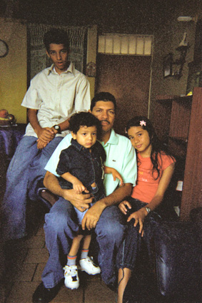 Plano Medio. Imagen tomada en interior, con escasas condiciones de luz. Puesta en escena de un grupo de personas donde se observa un hombre adulto sentado en una silla y junto a él dos niños y una niña. Al fondo se ven algunos elementos decorativos del lugar.