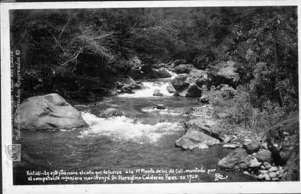 Río Cali. Nacedero del brazo fluvial que da fuerza a la 1a. planta de luz de Cali que fuera montada por el Ingeniero nariñense Florentino Calderón Pérez. Cali. 1925.
