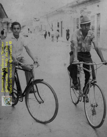 Pasear por las calles del pueblo en bicicleta junto con los amigos, es una de las costumbres más arraigadas de todos los vallecaucanos. Manuel Alzate y amigo por las calles de Cartago. C. 1962