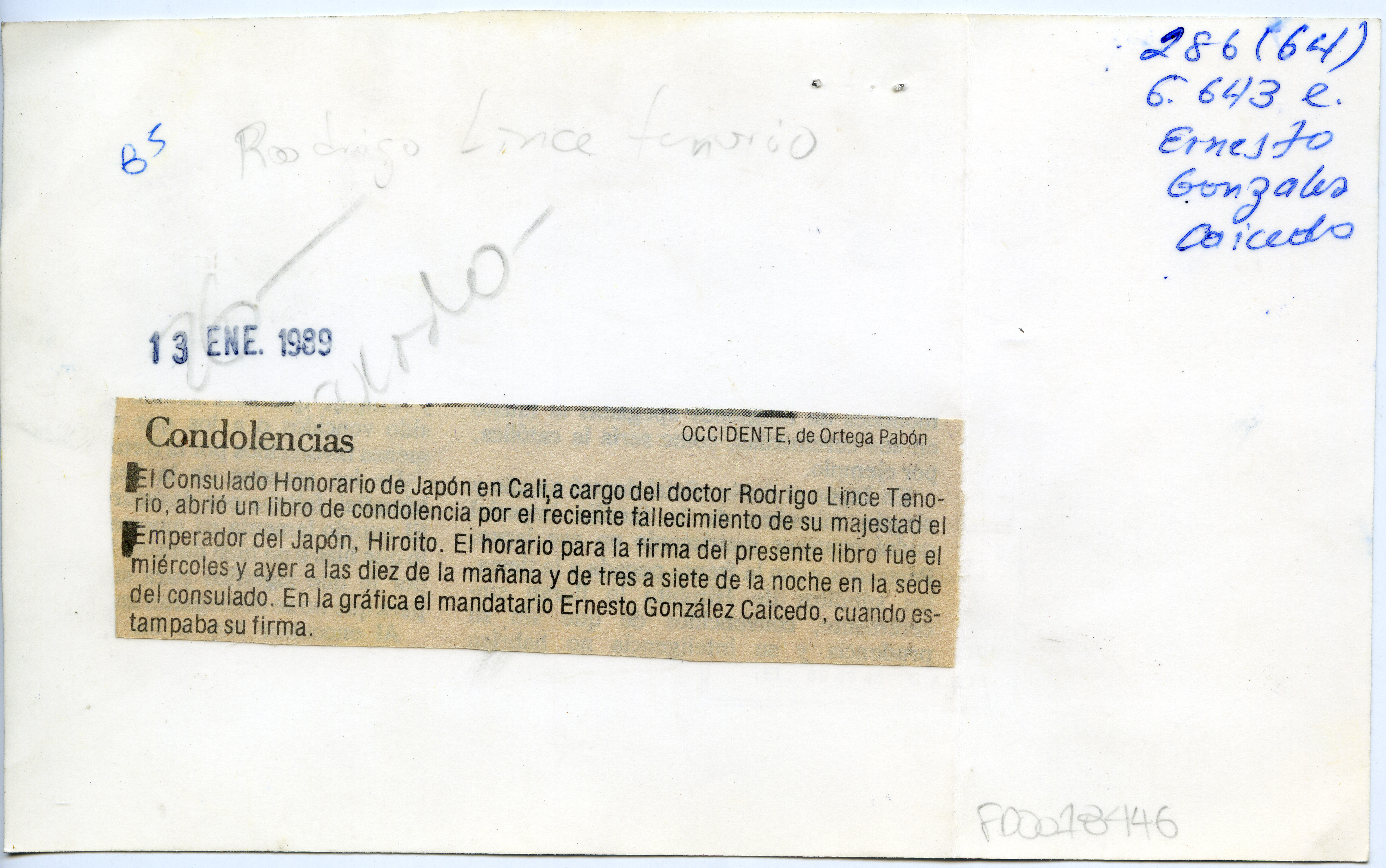Al reverso de la fotografia se anexa recorte: "Condolencias. El Consulado Honorario de Japon en Cali, a cargo del doctor Rodrigo Lince Tenorio, abrio un libro de condolencias por el reciente fallecimiento de su majestad el Emperador del Japon, Hiroito. El horario para la firma del presente libro fue el miercoles y ayer a las diez de la mañana y de tres a siete de la noche en la sede del Consulado. En la grafica el mandatario Ernesto Gonzalez Caicedo cuando estampa su firma