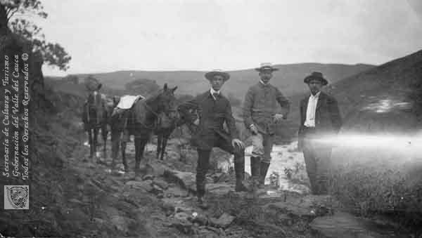 Estos tres señores, que lucen polainas, eran llamados "las tres gracias". Finca Santa Rita. Santiago de Cali, C. 1910.