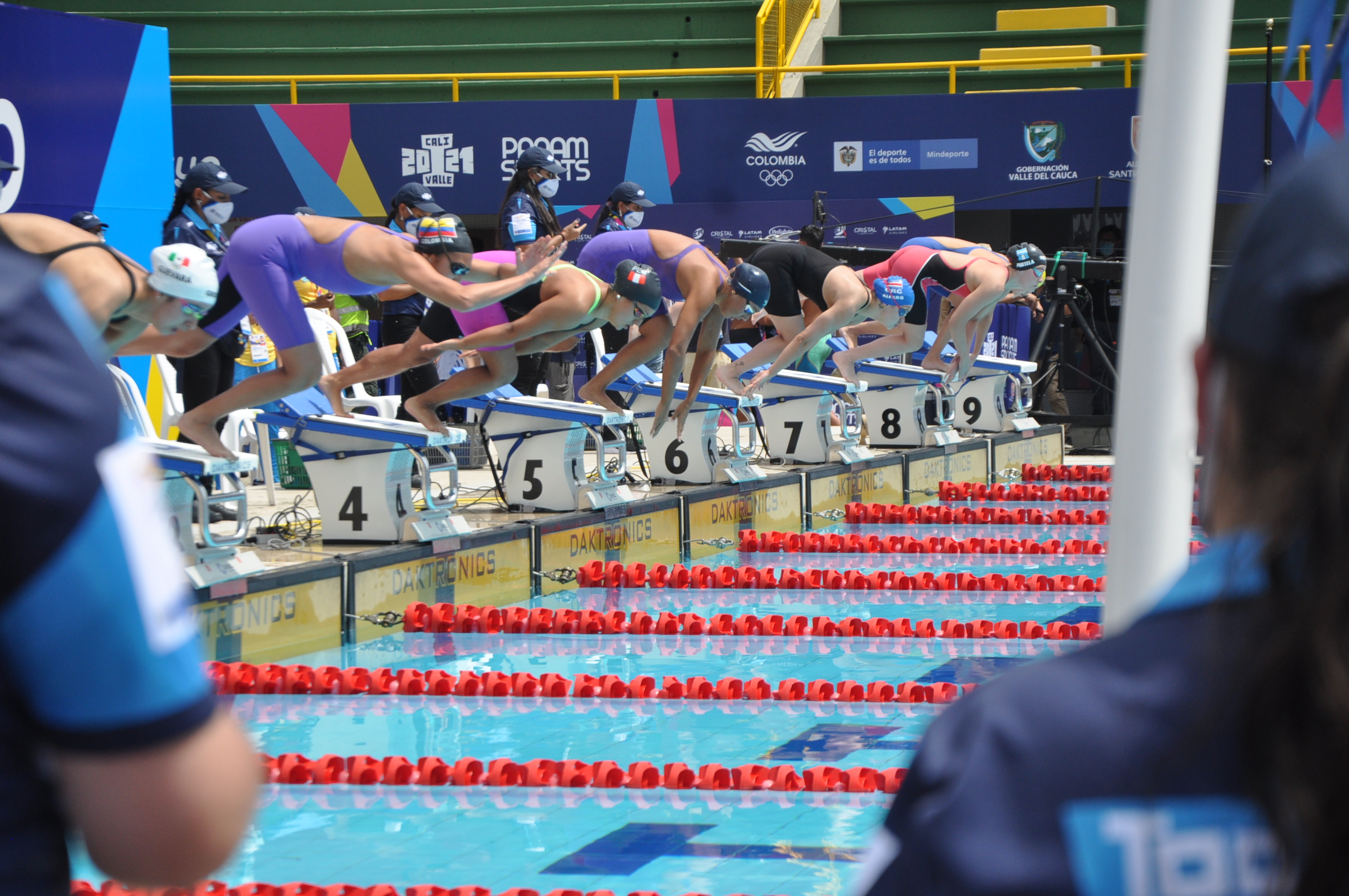 En la fotografía observamos a las participantes realizando el clavado para iniciar la competencia de natación de los "I Juegos Panamericanos Junior" llevados a cabo en la ciudad de Cali.