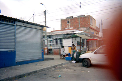 Plano general. Exterior día. Mujeres en puesto de bebidas ambulante. Carro en costado lateral derecho, como punto distintivo. Construcciones de fondo.