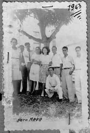 FOTO MAPA (1943). Marcial Peña con un grupo de amigos, bajo la sombra del árbol en el parque principal del municipio de Buenaventura & 202079. BUENAVENTURA: Biblioteca Departamental Jorge Garces Borrero.