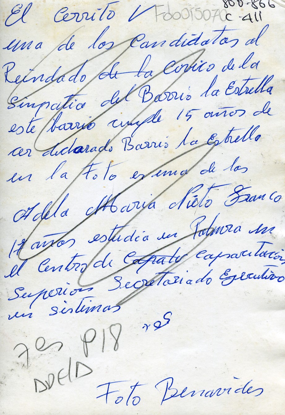 Retrato de Adela María Nieto Franco, candidata del barrio La Estrella al Reinado Cívico de la Simpatía Al reverso de la fotografía dice: "El Cerrito. Una de las candidatas al Reinado de la Cívico de la simpatía del Barrio la Estrella este barrio cumple 15 años de cer declarado Barrio La Estrella en la foto es una de la Adela Maria Nieto Franco 17 años estudia en Palmira en el centro de capacitación superior secretariado ejecutivo en sistemas."