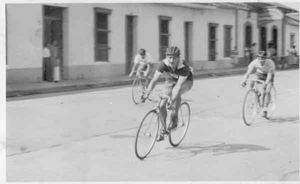 Competencia ciclística por el parque San Nicolás. En prime plano Gilberto Cuevas y Argemiro Sánchez. Santiago de Cali, 1949.