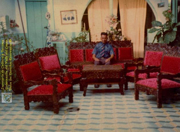 El señor Manuel Jesús en la sala de su casa adornada con hermosos muebles en terciopelo, tallados en madera por él mismo