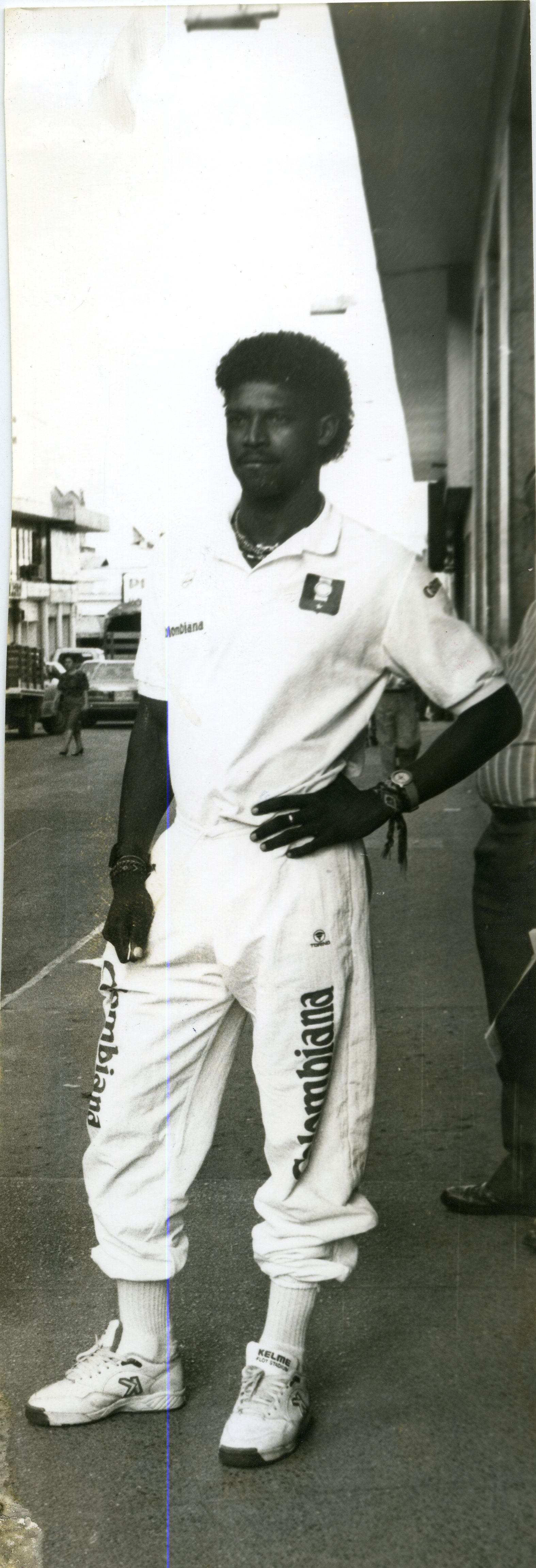 Fotografía de plano completo de Nestor Ortiz, donde se ve en sudadera, esta parado en medio de la via pública, tiene su mano izquierda en la cintura y la derecha esta sobre su muslo derecho, la sudadera tiene un escrito que dice, Colombiana, el buso igualmente tiene el mismo escrito y un escudo pequeño en la parte superior izquierda del pecho