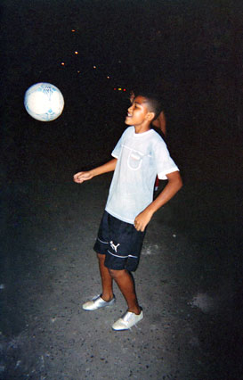 Plano entero. Exterior noche. Toma lateral. Retrato de niño con balón de fútbol congelado en el aire. Sobresalen focos lumínicos en franja superior.