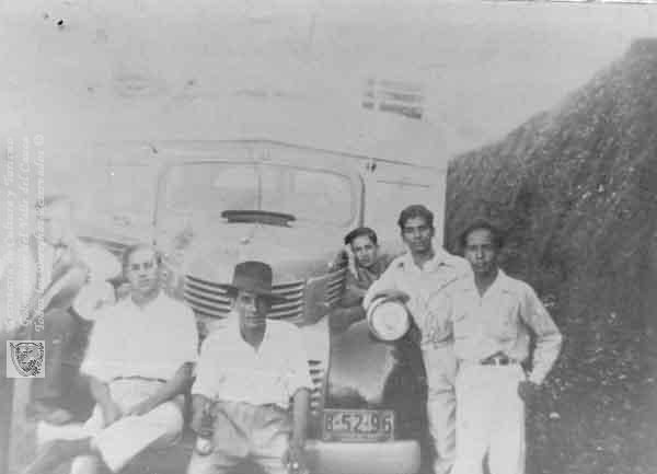 Grupo de colegas posando, con garbo y elegancia, en la chiva de don Francisco Antonio Rengifo Tamayo