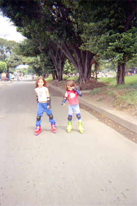 Plano general. Dos niñas montan en patines. Detrás de ellas separador vial con maleza y árboles. En el fondo de la imagen personas en medio de la ciclovía. Exterior día.