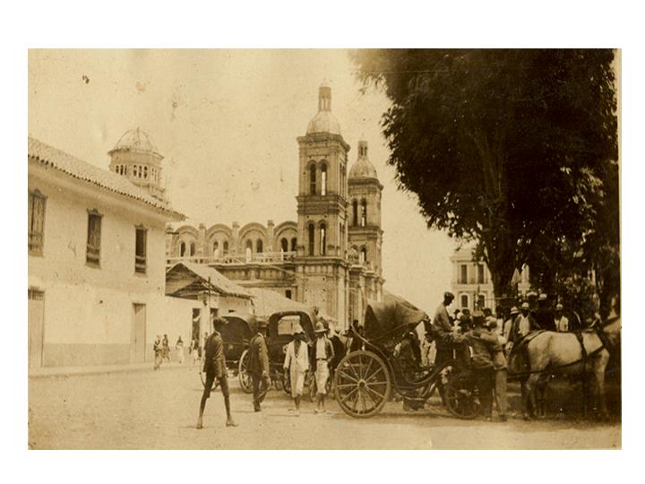 Parque principal del municipio. Obsérvese los coches de ruedas tirados por caballos parqueados en un costado del parque esperando los posibles pasajeros. Guadalajara de Buga, 1922.