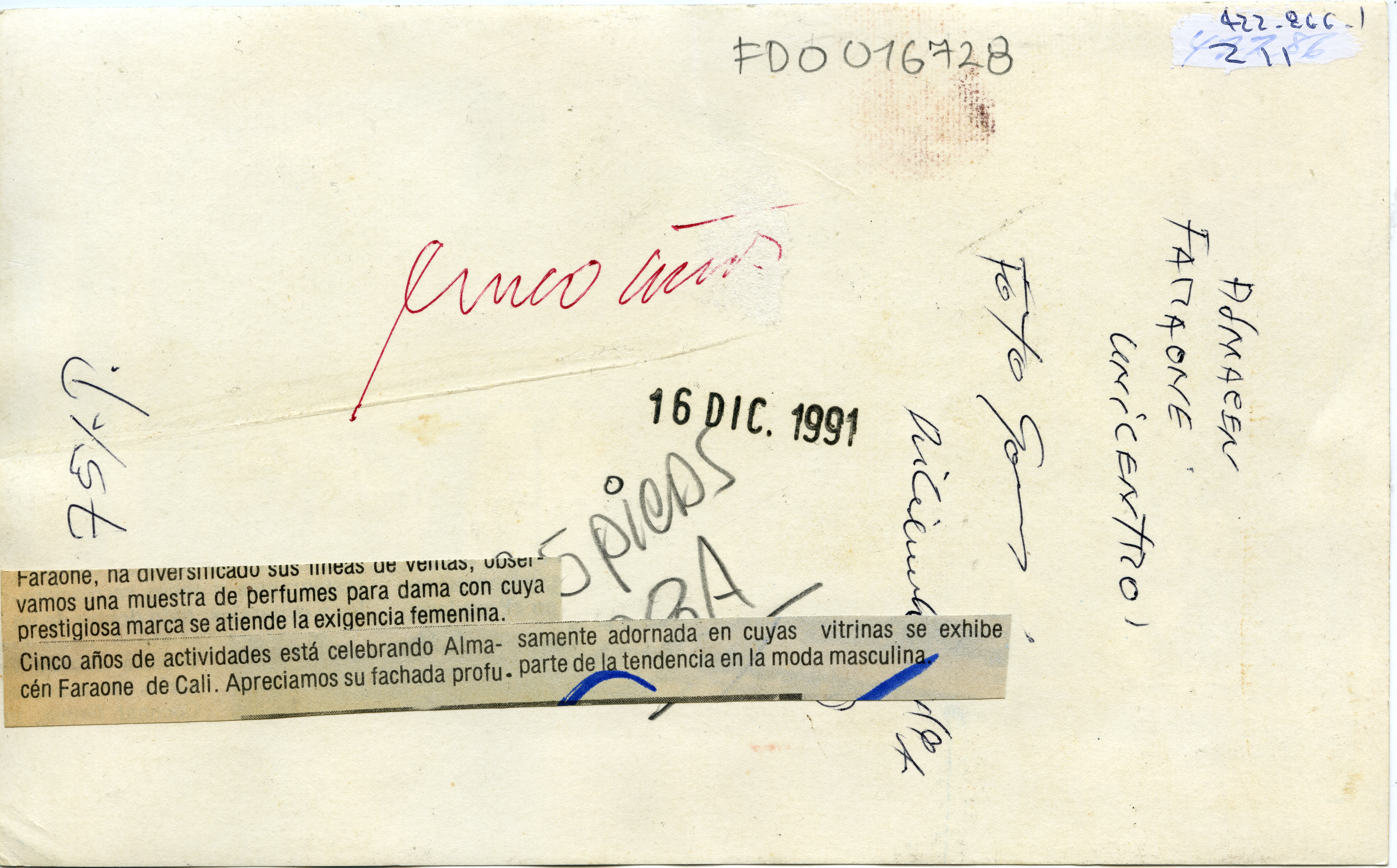 Al reverso de la fotografía se anexa recorte: "Faraone ha diversificado sus lineas de ventas, observamos una muestra de perfumes para dama con cuya prestigiosa marca se atiende la exigencia femenina. Cinco años de actividades está celebrando Almacén Faraone de Cali. Apreciamos su fachada profusamente adornada en cuyas vitrinas se exhibe parte de la tendencia en la moda masculina."