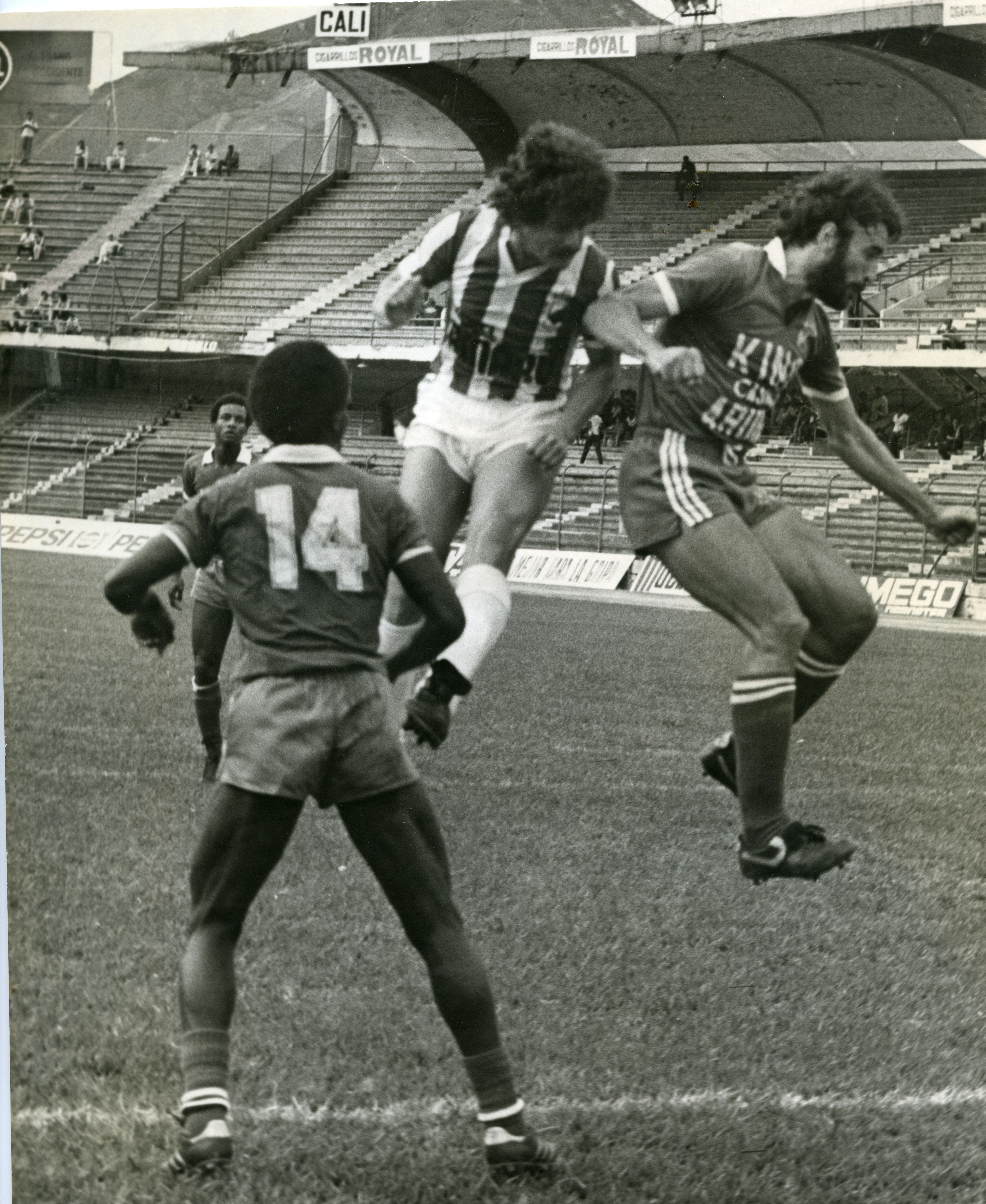 Escena del partido realizado entre el Deportivo Cali 1 Nacional 0, en el estadio Olímpico Pascual Guerrero. Se aprecia público en la tribuna. Observamos en la camiseta jugador del Cali que dice: King Casino Aruba