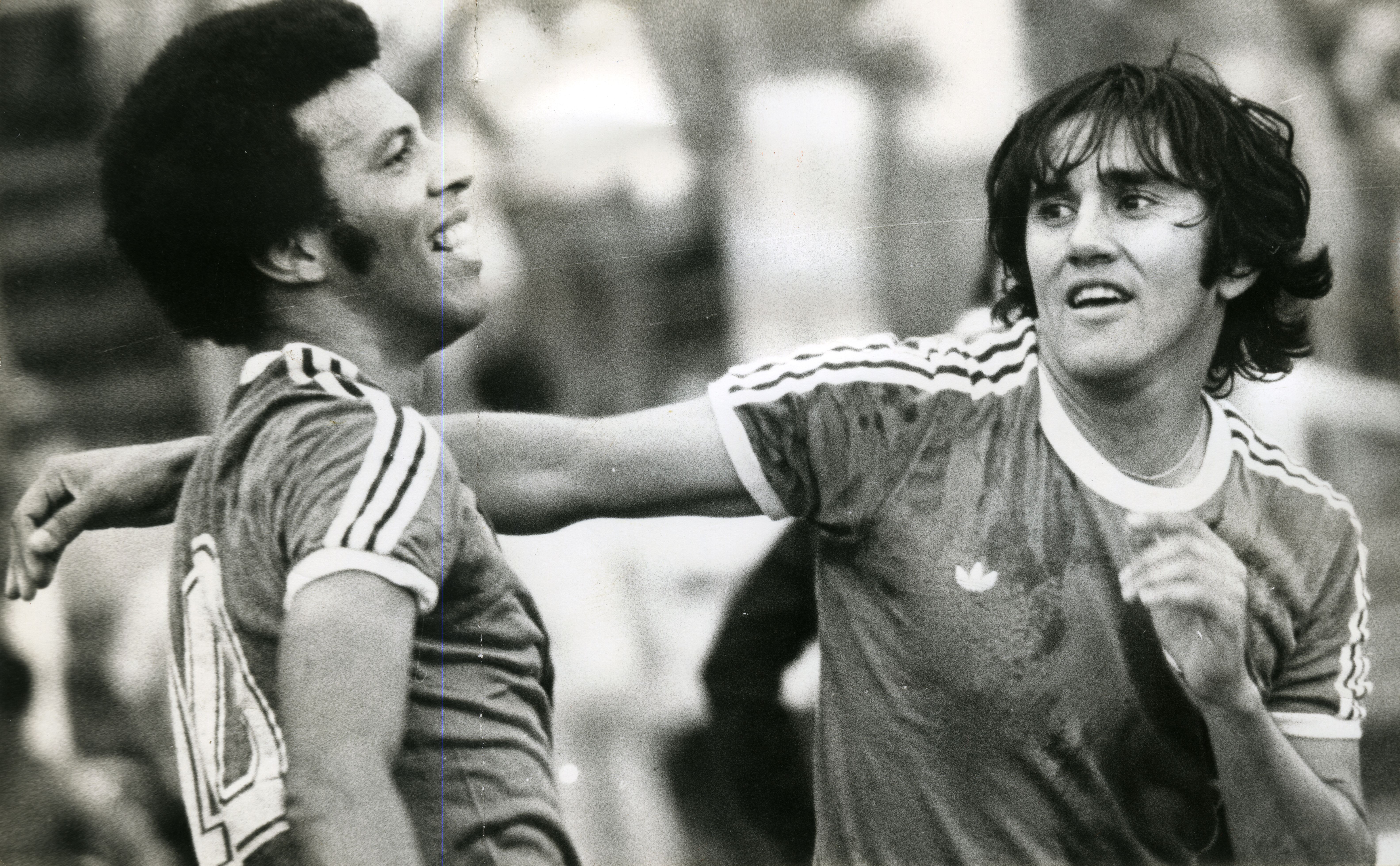 Partido de fútbol Deportivo Cali vs Caldas en el estadio Olímpico Pascual Guerrero de Cali, Valle del Cauca. Se aprecia jugadores Rafael Humberto y Mosquera en acción durante el partido