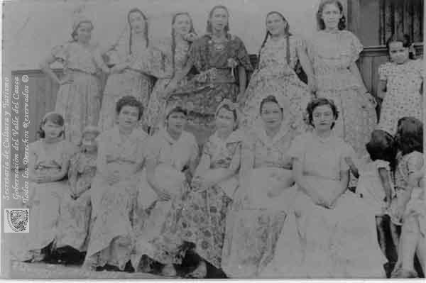 Elvia Alzate, Graciela Agudelo, Lola López, Elizabeth Velásquez, Maruja Restrepo, Mary Velásquez y la Hermana PastoraTorres, Elena González y Mercedes Colorado.Hacen parte de la comparsa culutural. El Aguila. 1939.
