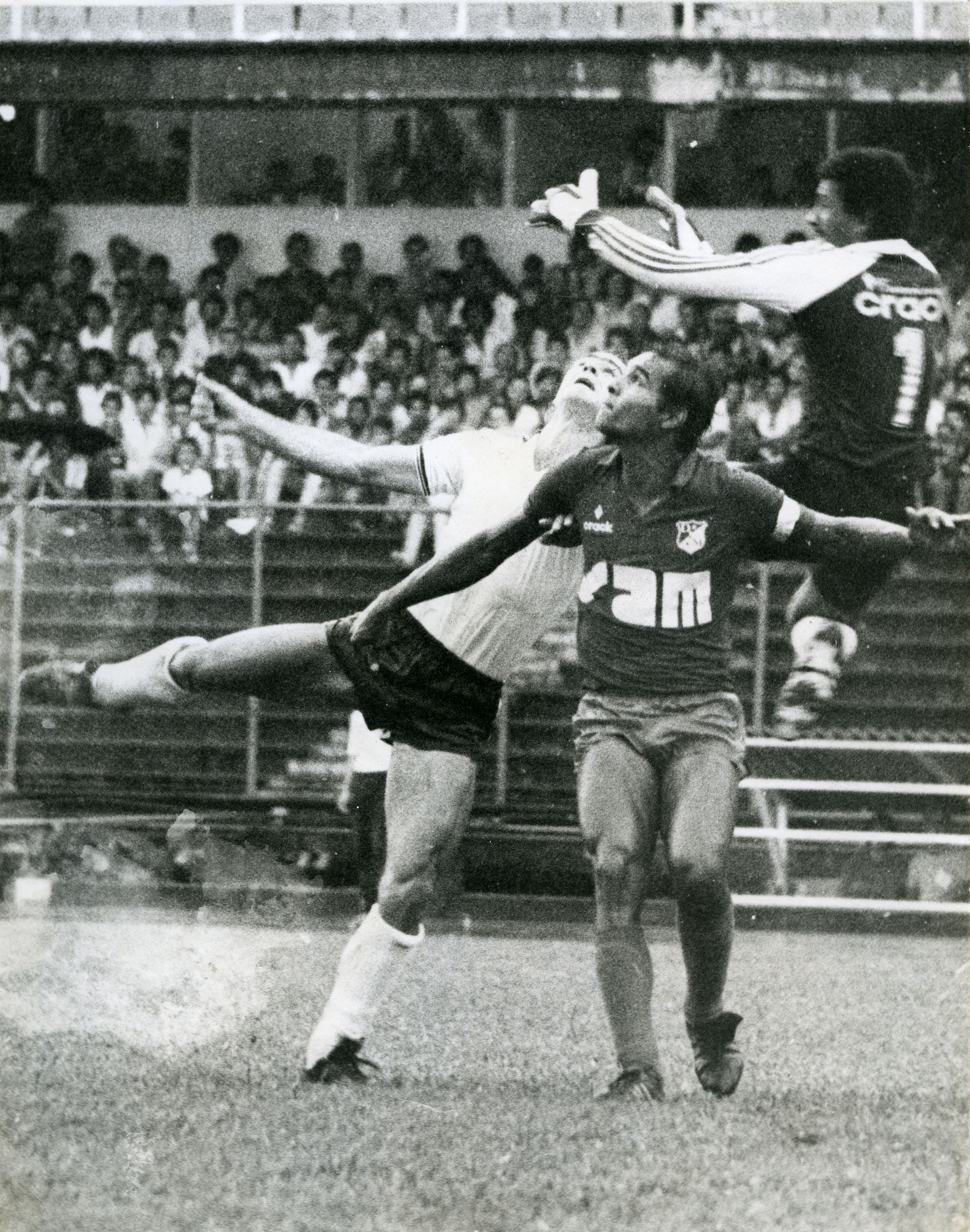 Partido de fútbol entre los equipos Deportivo Cali y Medellín, jugado en el estadio Pascual Guerrero. Se aprecia portero Gómez consigue atrapar el balón. Observamos público en la tribuna