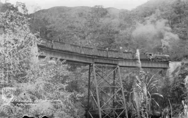 El Ferrocarril del Pacífico en uno de aquellos cruces que ponían a rezar al pasajero. Cali. Fecha aproximada: 1927.