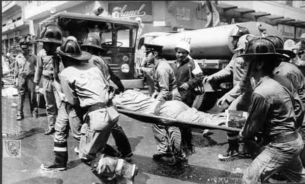 Cuerpo de bomberos en acción, rescatando a heridos en un incendio. Santiago de Cali, C. 1980