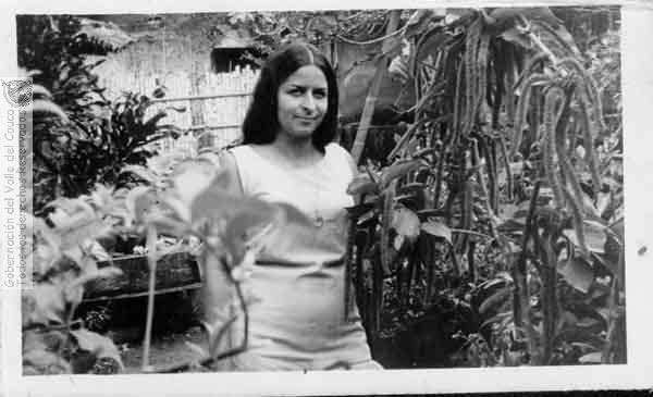 Gladis Satizabal en el jardín interior de la casa materna. Estos jardines y patios de las casa de los pueblos se caracterizaron por tener abundantes matas ornamentales, plantas medicinales, árboles frutales y en algunos casos frutos de pancoger. Fecha por definir.