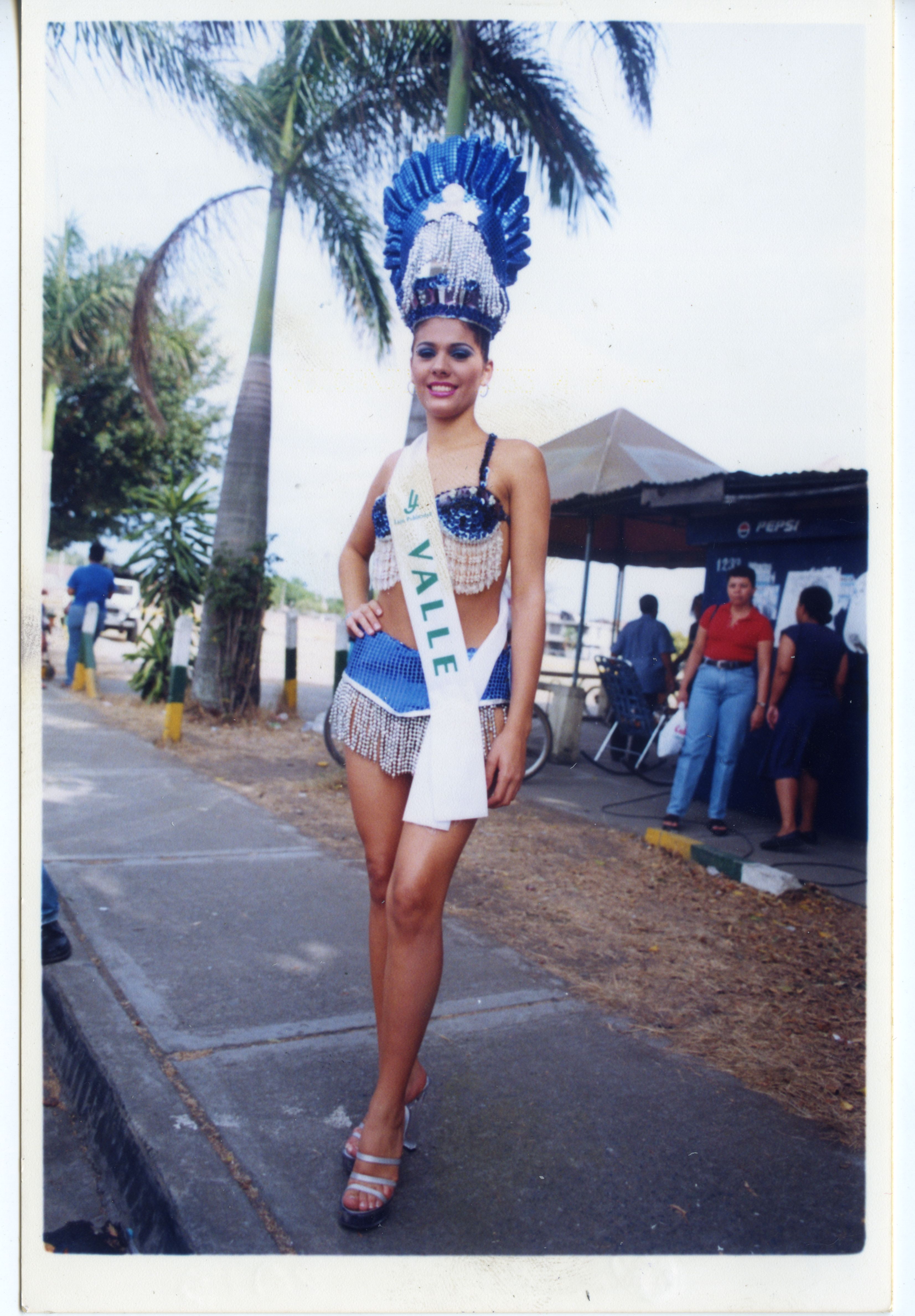 Fotografía de fondo completo de una persona que viste traje en dos piezas de color azul con blanco, se observa que tiene un sombrero exótico de color azul, se sonrie, tambien tiene una cinta de color blanco en su dorso con letras verdes donde se aprecia el nombre de Valle, detras de la persona se ve a varias personas más observandola.