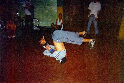 Interior noche. En plano medio se encuentra en extraña posición inherente al Break Dance un joven, apoyado sobre su cabeza. Otros jóvenes observan el difícil ejercicio.