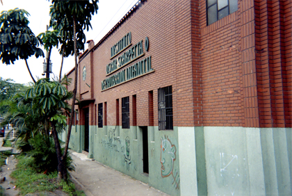 Plano medio. Imagen tomada en exterior, donde se puede apreciar la fachada del instituto Oscar Scarpetta o de Protección Infantil, con muros de ladrillo a la vista y un zócalo de color verde.