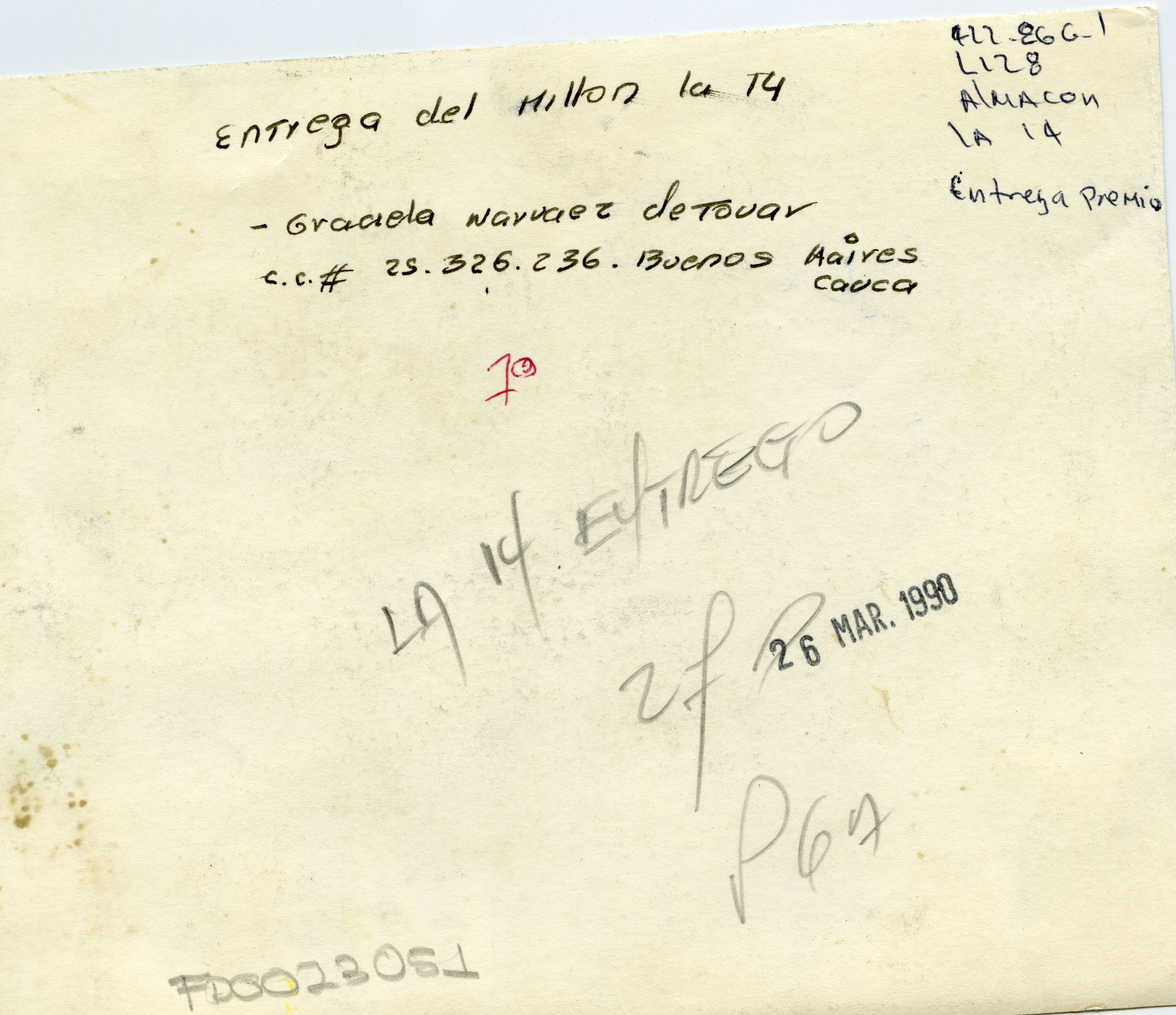 Almacenes la 14, fue fundada en Cali en el año 1964 por Abel Cardona Franco y sus hermanos. Su oferta comercial se desarrolla a través de formatos de grande superficie y de tiendas de cercanía. La empresa es considerada una de las más importantes del suroccidente colombiano. Se aprecia al señor Aldemar Giraldo haciendo entrega del millón la 14 a la ganadora, Graciela Narváez de Tovar