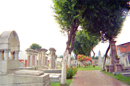 Plano general. Cementerio judío. En el centro corredor. Campo visual dominado por las tumbas. Arriba copas de árboles al lado derecho. Exterior día.