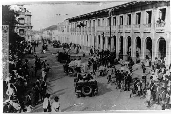 Desfile de carros frente al parque Cabal durante los Carnavales de 1934. Buga.