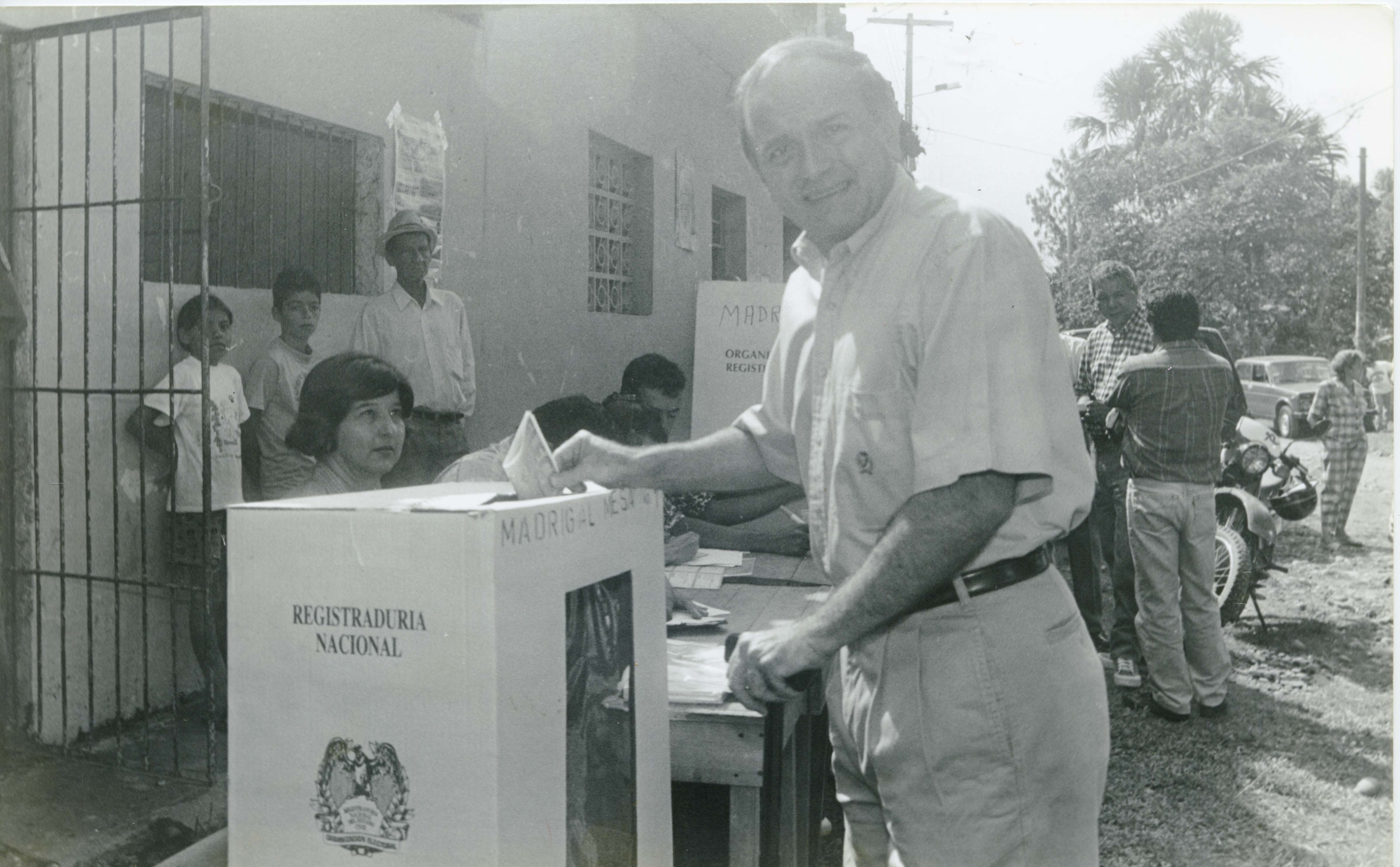 El Gobernador del Valle del Cauca, Gustavo Álvarez Gardeazábal, depositando su voto en la Registraduria Nacional / El Archivo del Patrimonio Fotográfico y Fílmico del Valle del Cauca es responsabilidad de la Biblioteca Departamental del Valle Jorge Garcés Borrero, por convenio de cooperación suscrito con la Secretaria de Cultura Departamental, con el fin de aunar esfuerzos para su conservación, preservación y divulgación del Archivo entre la comunidad Vallecaucana, especialmente entre los estudiantes e investigadores que visitan la Biblioteca, propiciando el su uso y consulta permanente. La universidad Icesi es un colaborador en el proceso de difusión, facilitando la tecnología que permite la consulta de las imágenes.