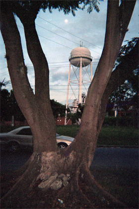 Plano general. En primer plano tronco de árbol. En el plano medio un automóvil ingresando a cuadro por el lado izquierdo. Paralelismo de líneas en plano superior. Tanque de almacenamiento al fondo de la imagen.