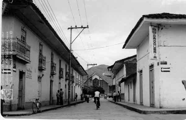 Panorámica de la Calle 7 con vista a la Antigua Iglesia de San Sebastián. ciclistas en la vía. Roldanillo, fecha aproximada, 1960